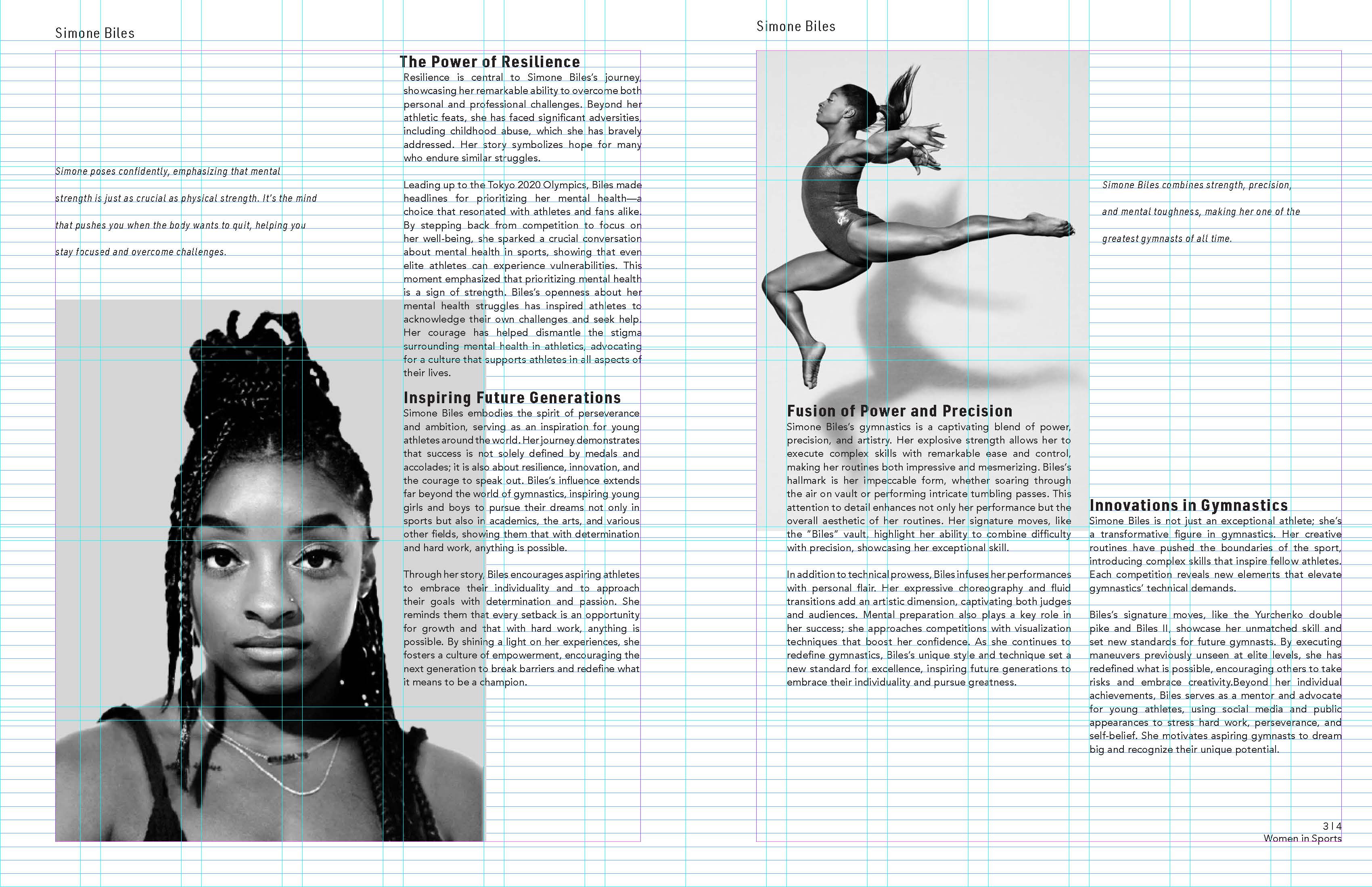 After finalizing the logomark, I moved on to designing the spreads for the publication. I began by experimenting with various grid systems until I decided on the correct one for my content. Next, I selected, legible, fitting typefaces for the body copy and ensured that the images and text worked cohesively. The process then involved refining and iterating until everything came together.