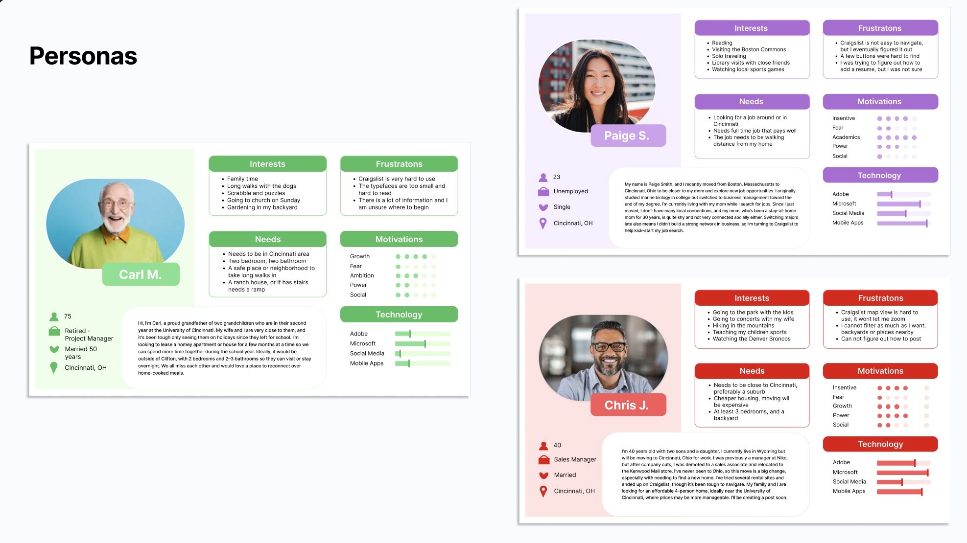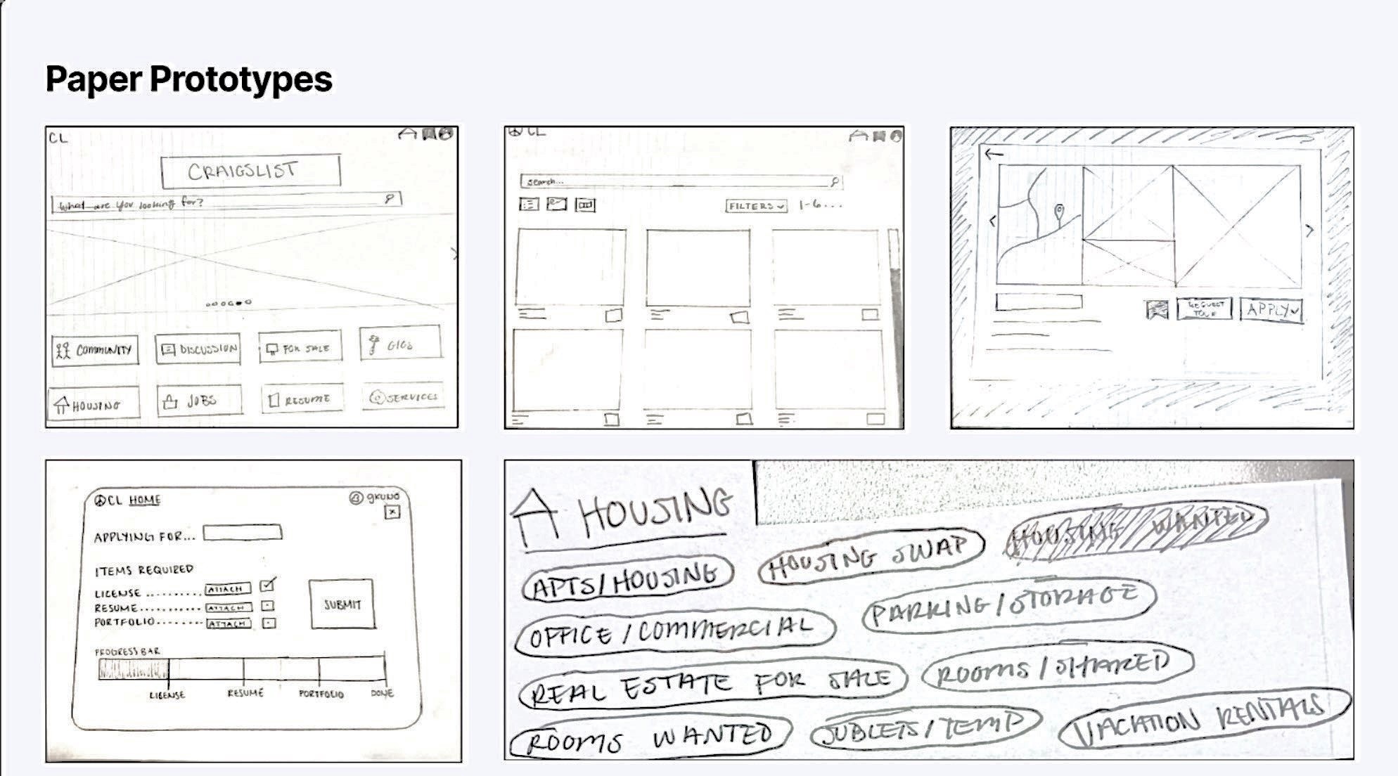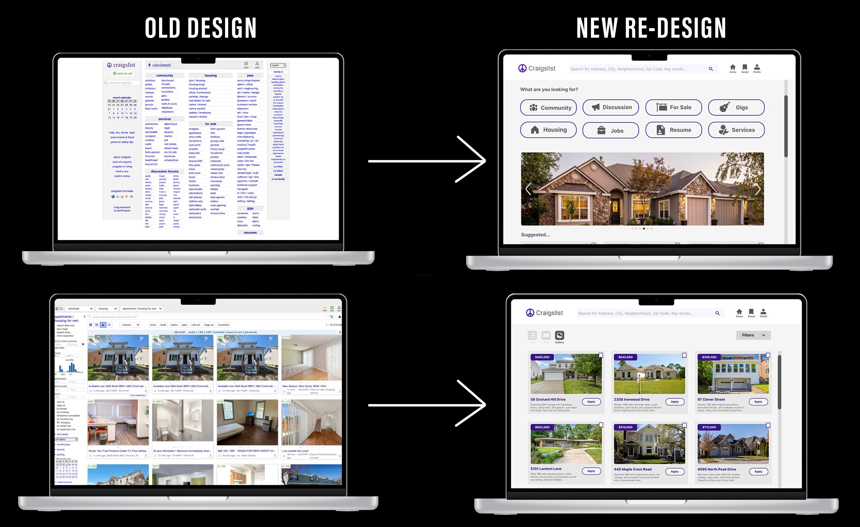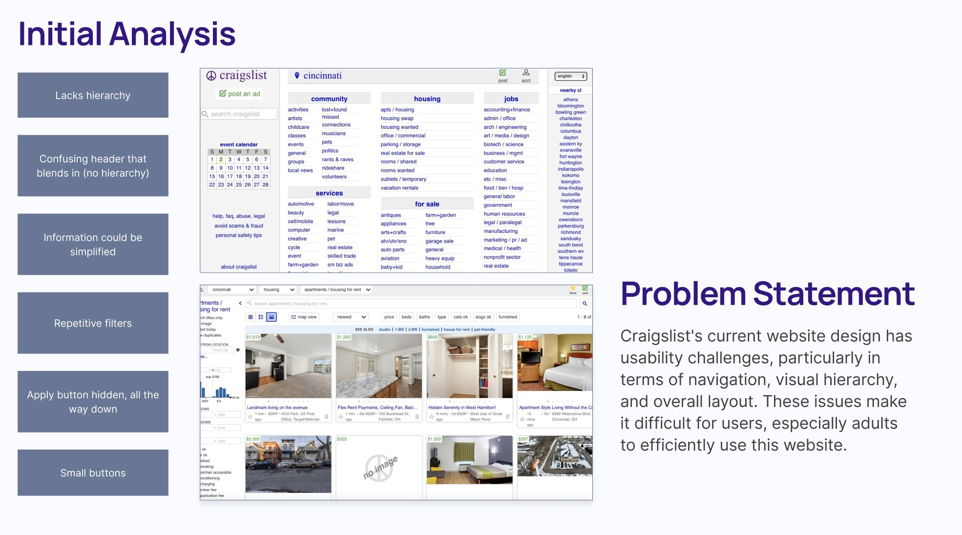 For this project, my team and I redesigned the Craigslist website. Our biggest focus was on accessibility, navigation, and usability, especially for older users and those who are less experienced internet users. We identified key issues such as poor hierarchy, small buttons, confusing navigation, and redundant filters. Our solution brought clarity, larger and more legible typography, simplified layouts, and intuitive navigation to create a more user-friendly experience.